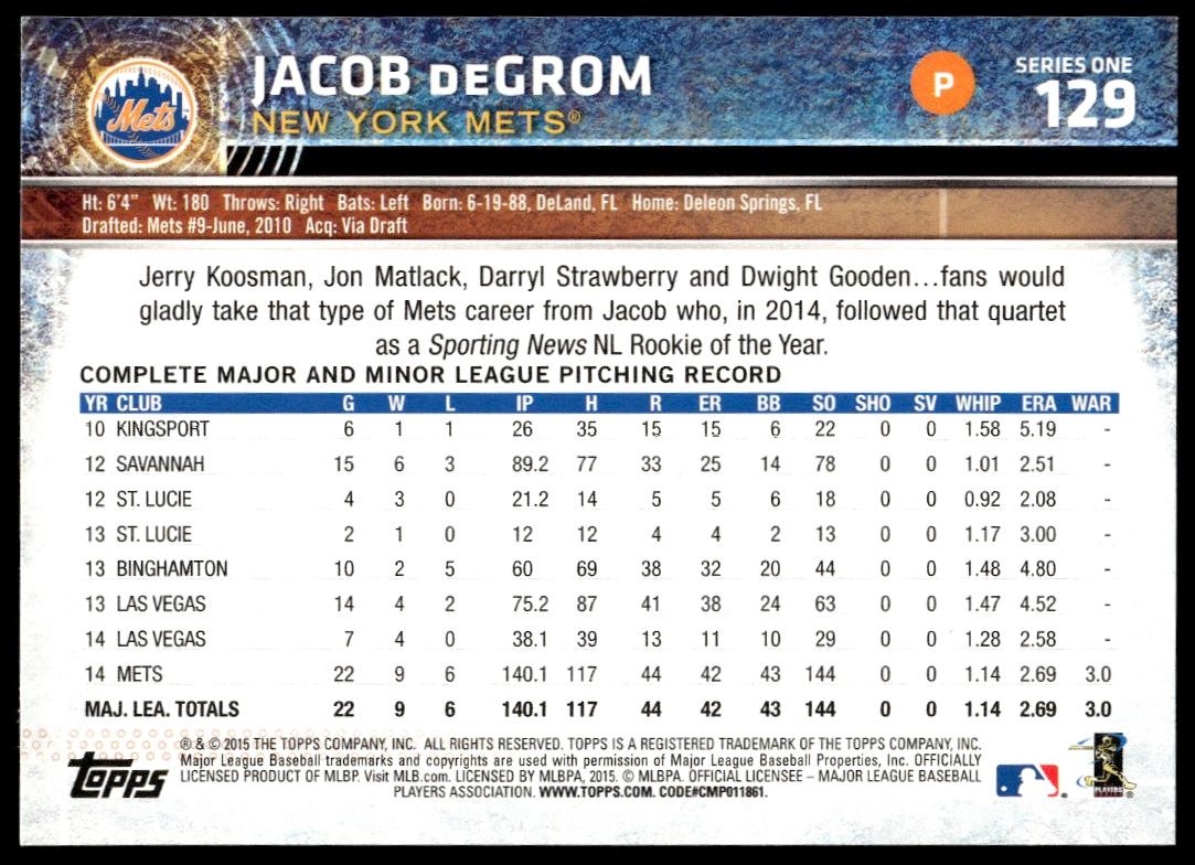 This Baseball card, from 2015 is part of the Topps Series 1 card set. Jacob deGrom is featured and has a card number of 129.