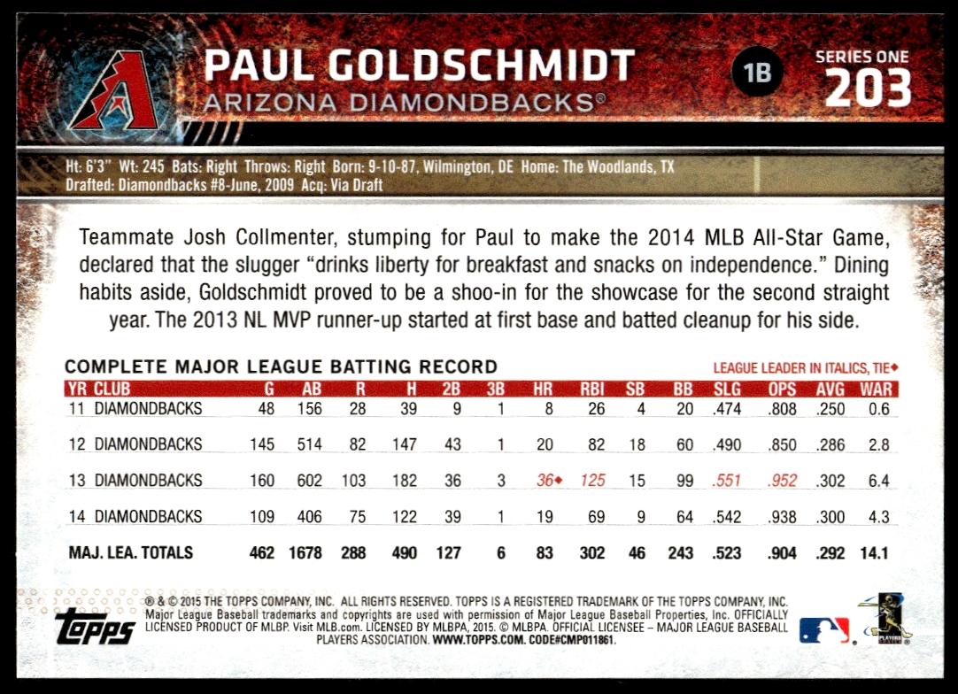 This BaseballΒ card, from 2015 is part of the Topps Series 1Β card set. Paul Goldschmidt is featured and has a card number of 203.