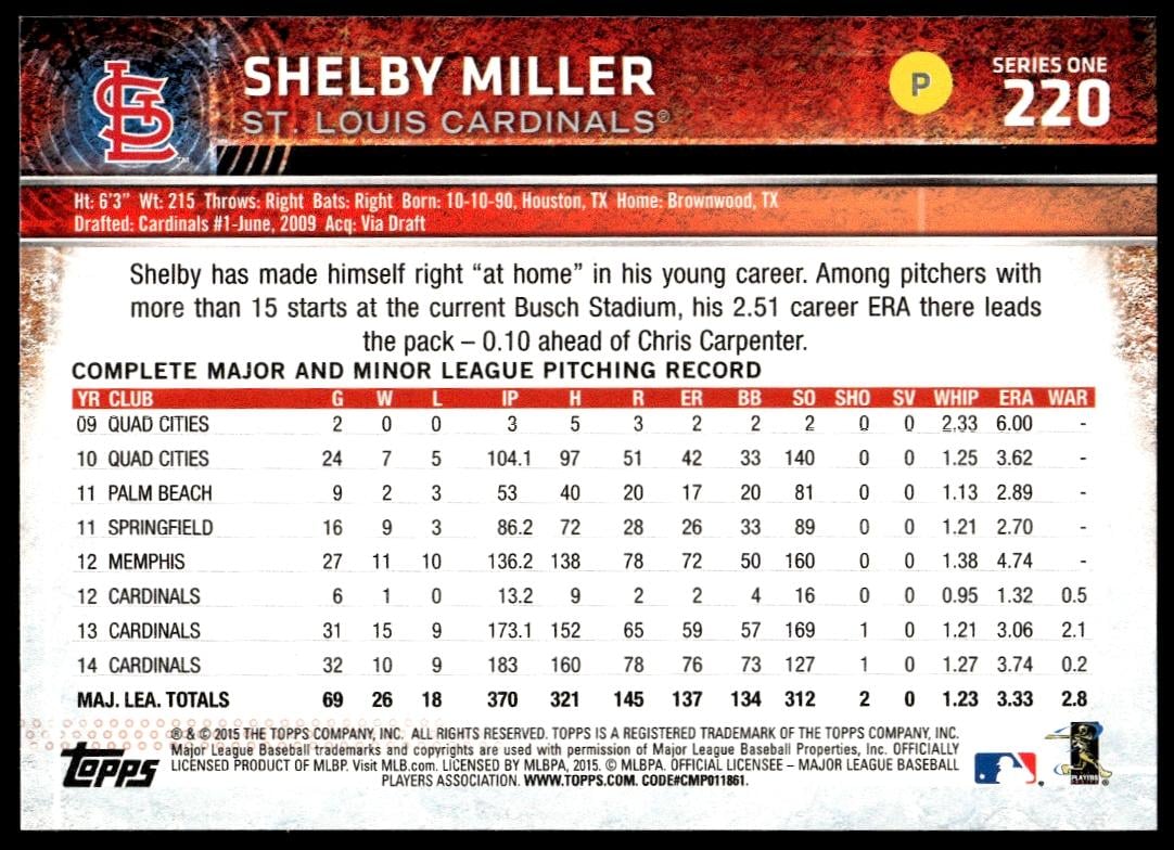 This Baseball card, from 2015 is part of the Topps Series 1 card set. Shelby Miller is featured and has a card number of 220.