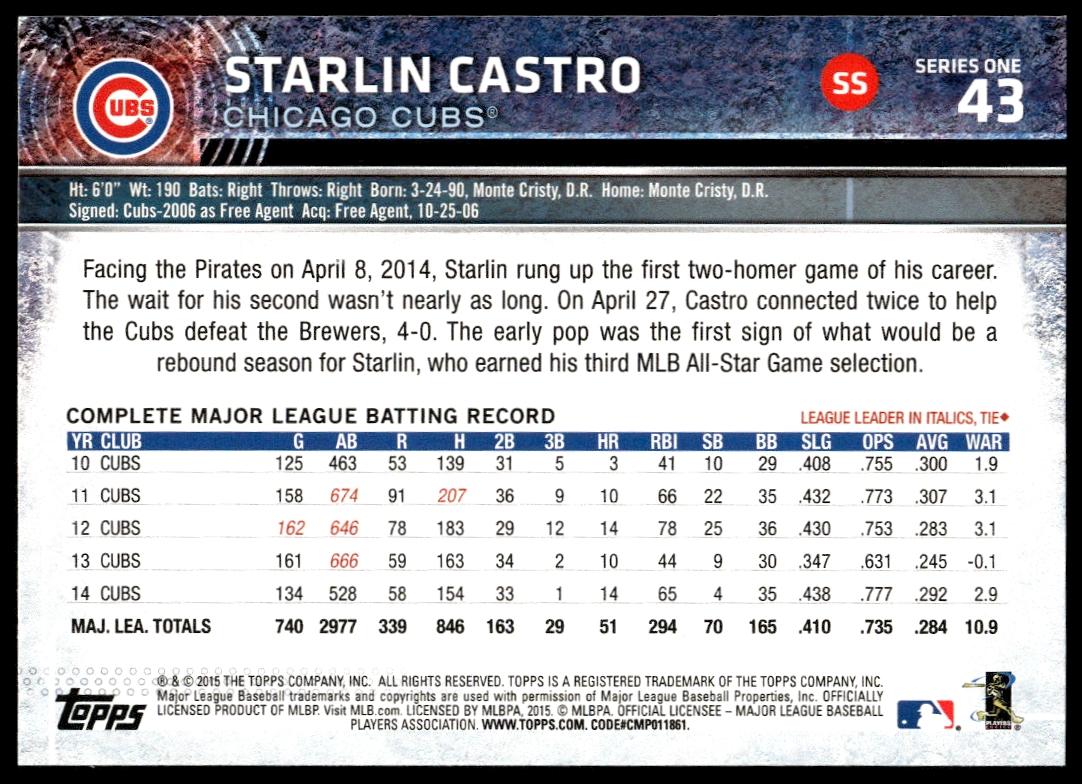 This BaseballΒ card, from 2015 is part of the Topps Series 1Β card set. Starlin Castro is featured and has a card number of 43.