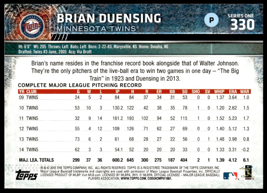 This Baseball card, from 2015 is part of the Topps Series 2 card set. Brian Duensing is featured and has a card number of 330.