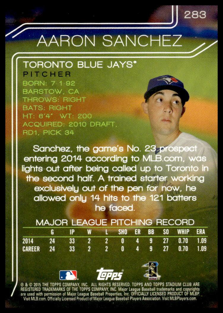 This Baseball card, from 2015 is part of the Topps Stadium Club card set. Aaron Sanchez is featured and has a card number of 283.