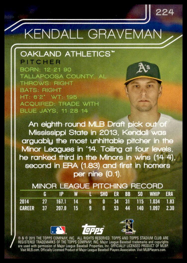 This Baseball card, from 2015 is part of the Topps Stadium Club card set. Kendall Graveman is featured and has a card number of 224.