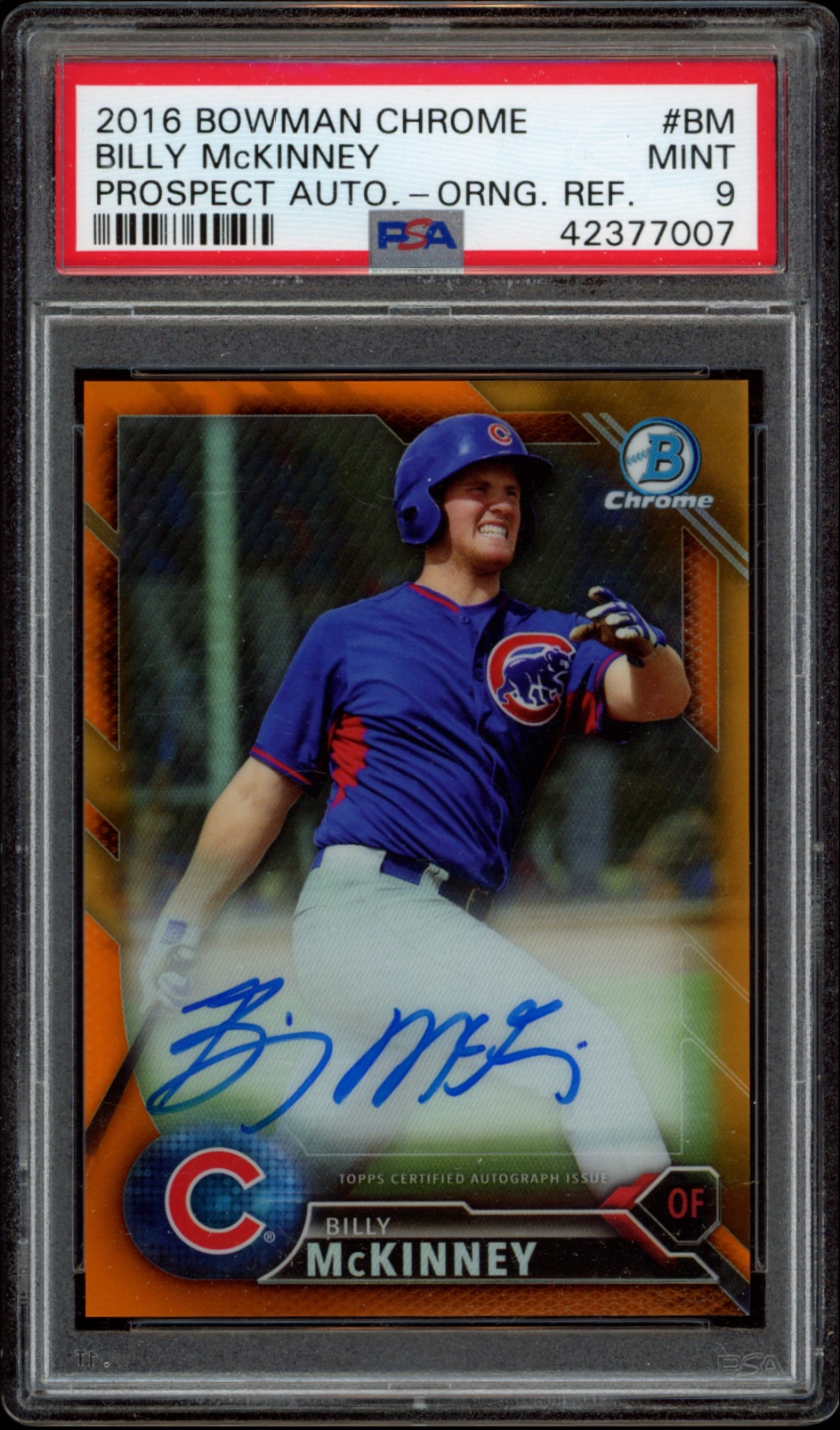 2016 Bowman Chrome Billy McKinney Autograph Orange Shimmer #CPA-BM (/25) graded PSA 9, a rare collectible for enthusiasts and investors.