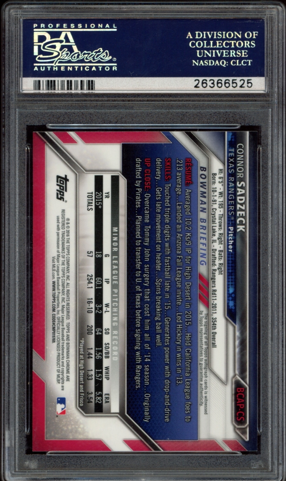 This Baseball card, from 2016 is part of the Bowman Chrome card set. Connor Sadzeck is featured and has a card number of BCAP-CS. It is graded by PSA and has a numeric grade of 10.