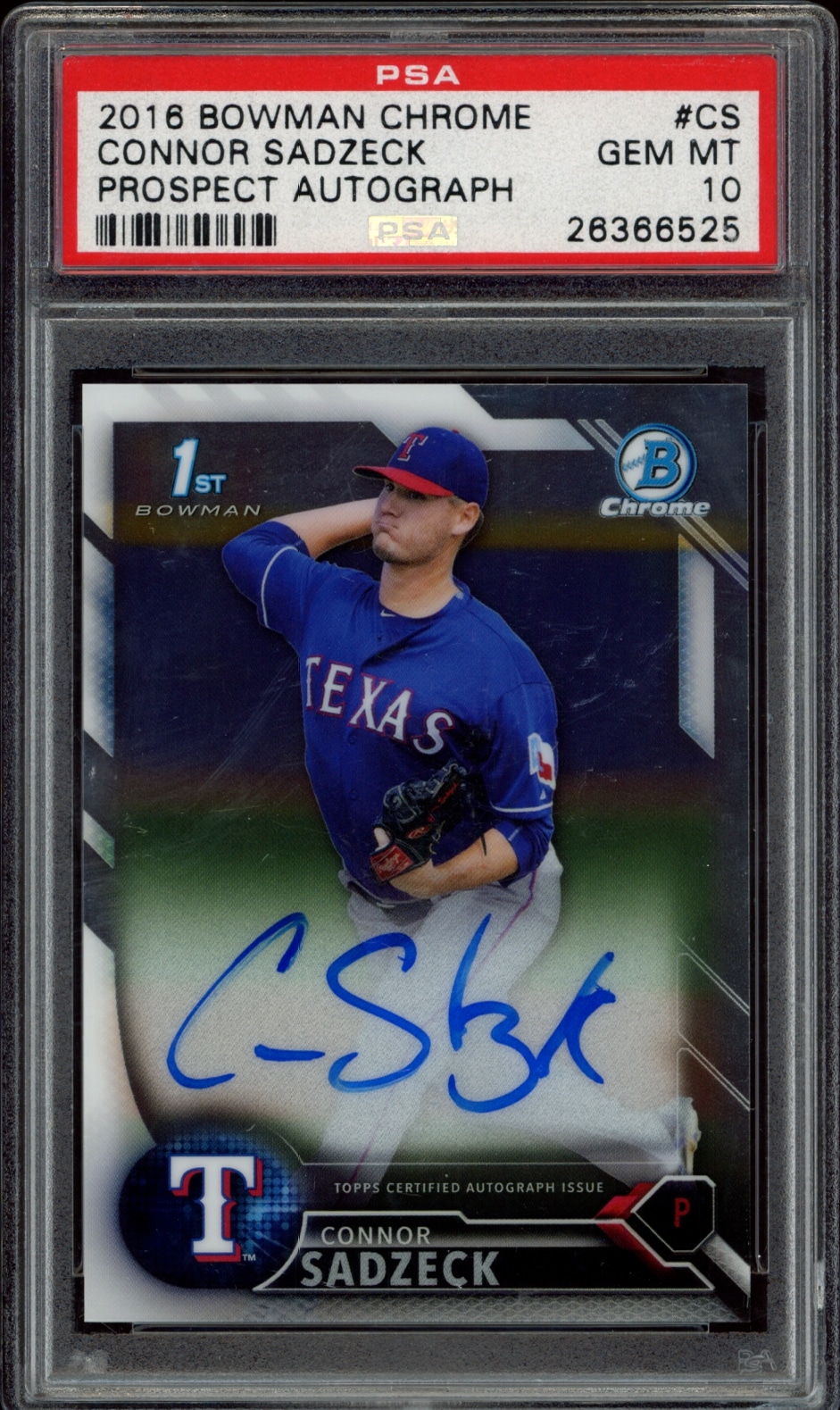 2016 Bowman Chrome Connor Sadzeck Autograph, graded PSA 10. A must-have for collectors and fans of rising baseball stars.