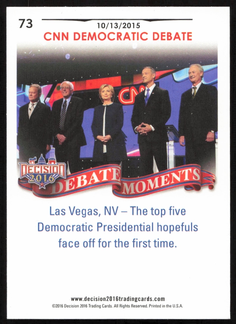 This Political card, from 2016 is part of the Leaf Decision card set. 10/13/2015 is featured and has a card number of 73.