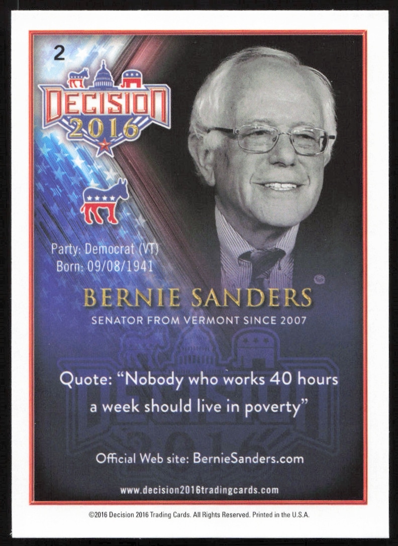 This Political card, from 2016 is part of the Leaf Decision card set. Bernie Sanders is featured and has a card number of 2.