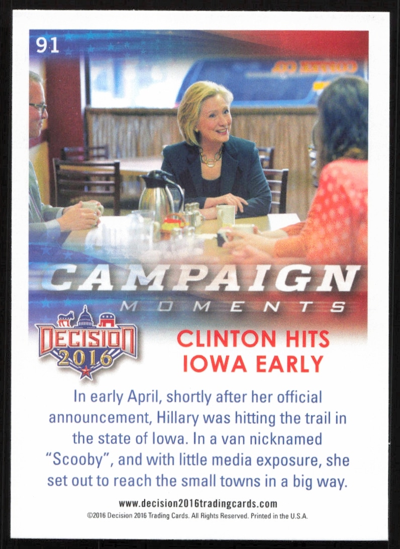 This Political card, from 2016 is part of the Leaf Decision card set. Campaign Moments is featured and has a card number of 91.