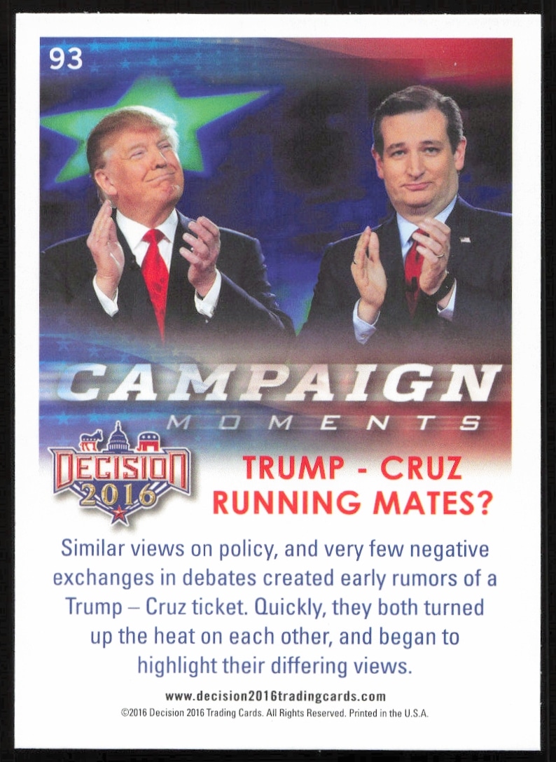 This Political card, from 2016 is part of the Leaf Decision card set. Campaign Moments is featured and has a card number of 93.