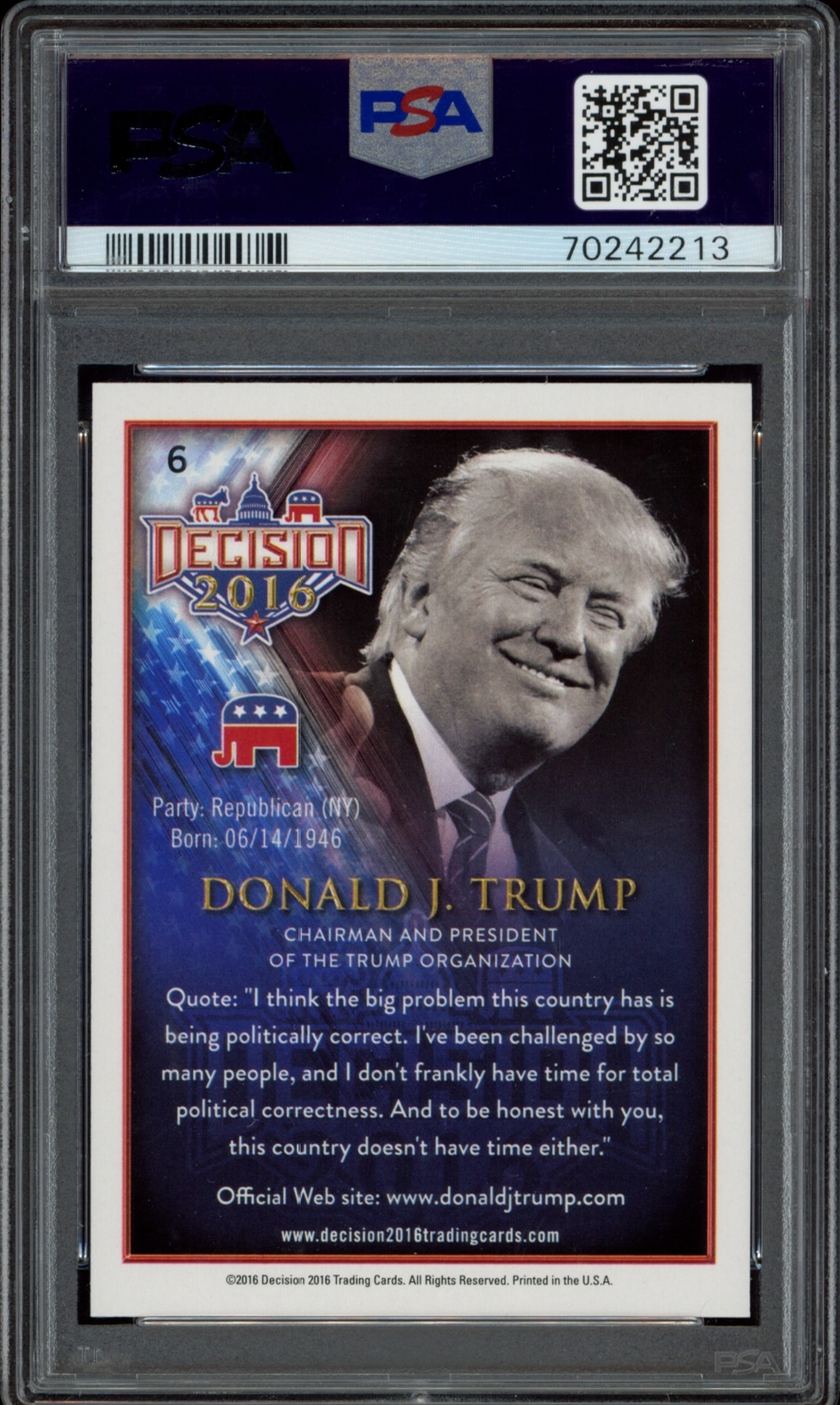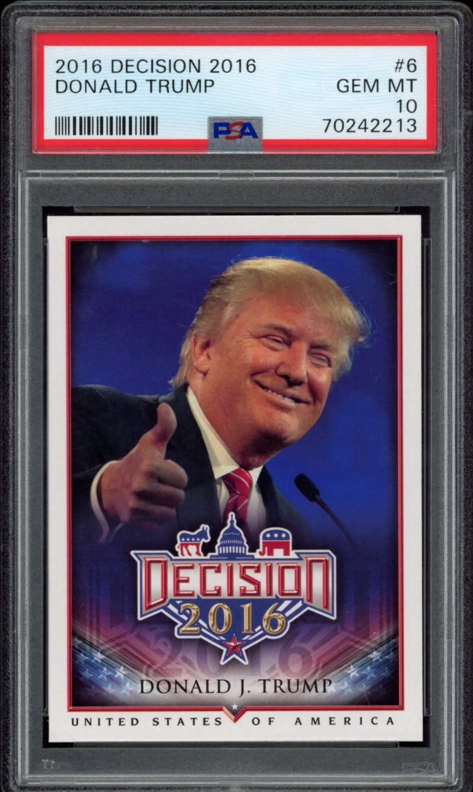 This Political card, from 2016 is part of the Leaf Decision card set. Donald Trump is featured and has a card number of 6. It is graded by PSA and has a numeric grade of 10.