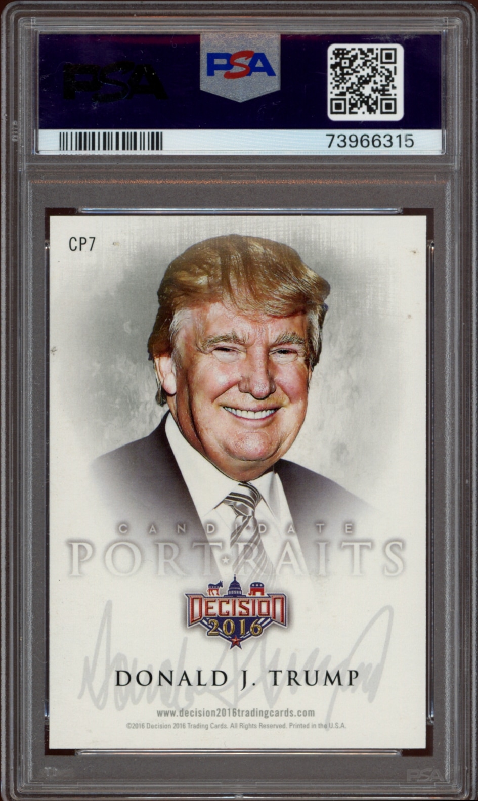 This Political card, from 2016 is part of the Leaf Decision card set. Donald Trump is featured and has a card number of CP7. It is graded by PSA and has a numeric grade of 7.