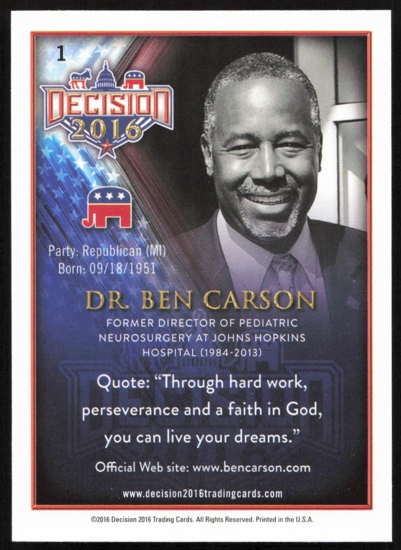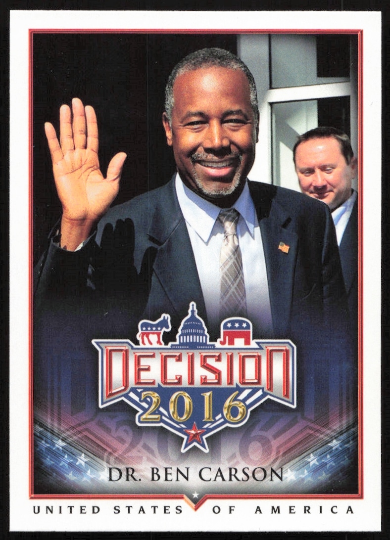 This Political card, from 2016 is part of the Leaf Decision card set. Dr. Ben Carson is featured and has a card number of 1.