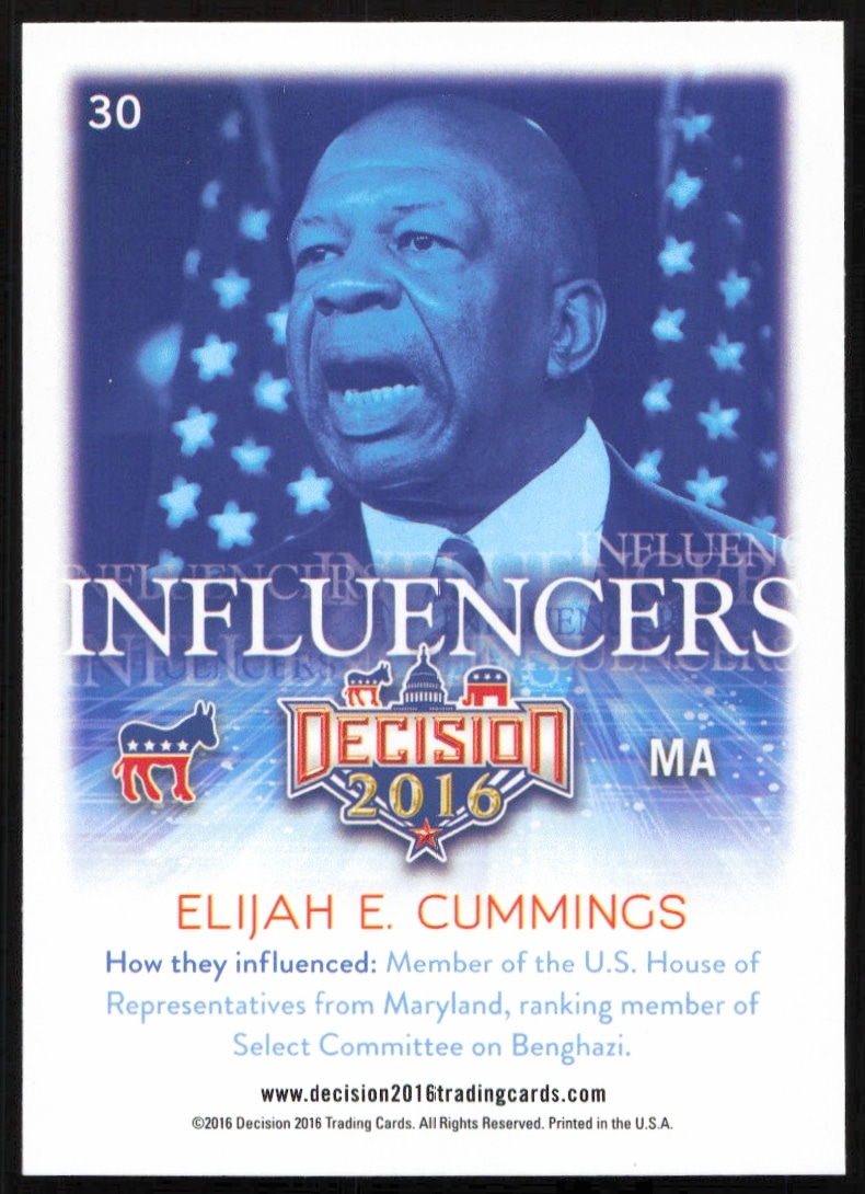 This Political card, from 2016 is part of the Leaf Decision card set. Elijah E. Cummings is featured and has a card number of 30.