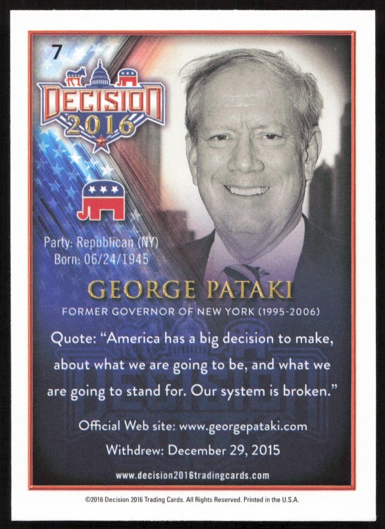 This Political card, from 2016 is part of the Leaf Decision card set. George Pataki is featured and has a card number of 7.