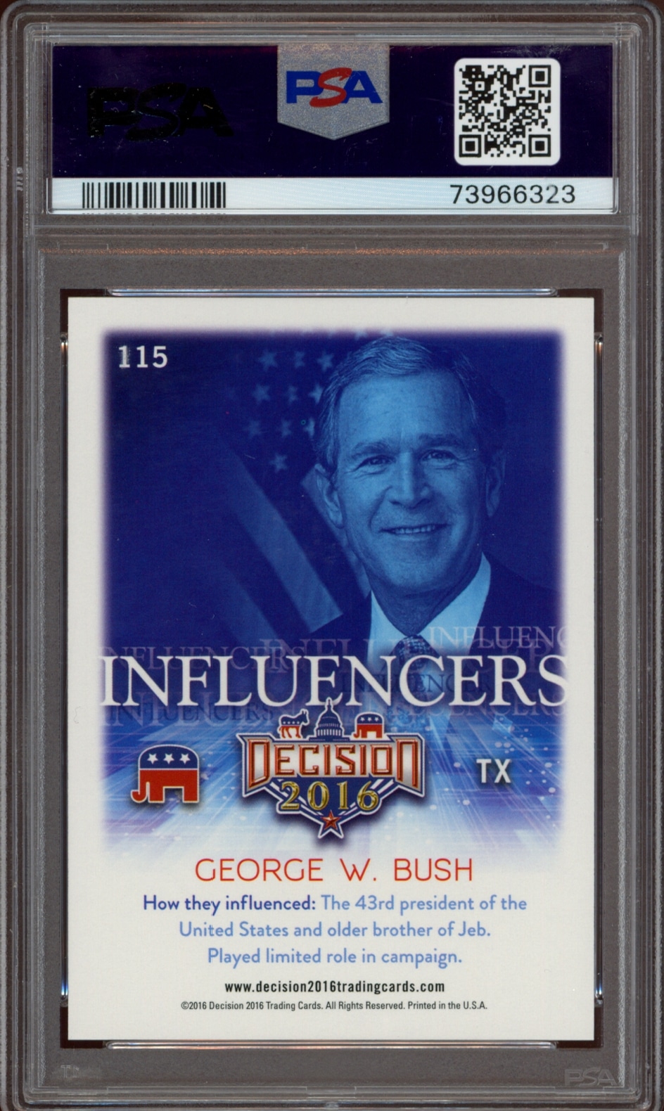 This Political card, from 2016 is part of the Leaf Decision card set. George W. Bush is featured and has a card number of 115. It is graded by PSA and has a numeric grade of 8.