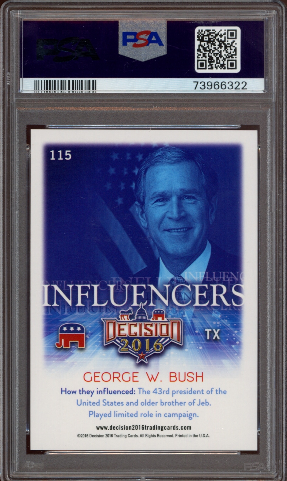This Political card, from 2016 is part of the Leaf Decision card set. George W. Bush is featured and has a card number of 115. It is graded by PSA and has a numeric grade of 9.