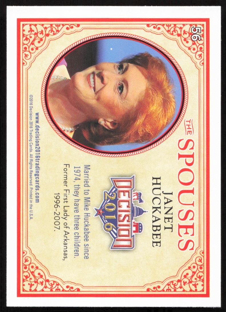This Political card, from 2016 is part of the Leaf Decision card set. Janet Huckabee is featured and has a card number of 56.