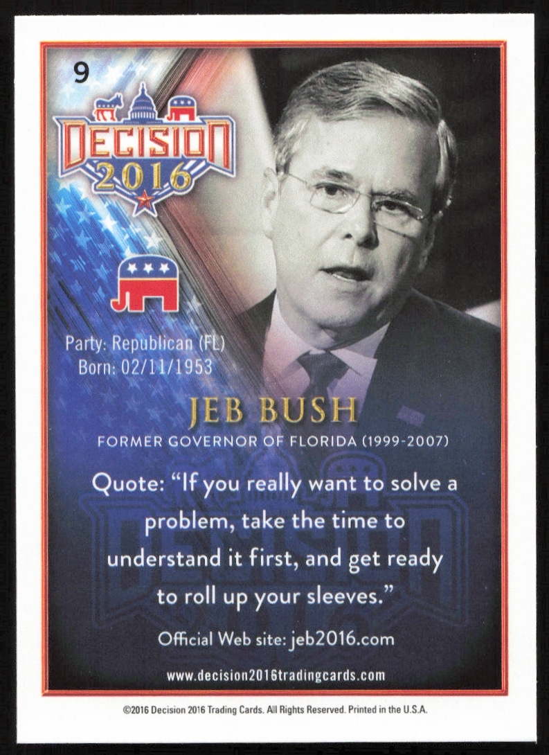 This Political card, from 2016 is part of the Leaf Decision card set. Jeb Bush is featured and has a card number of 9.