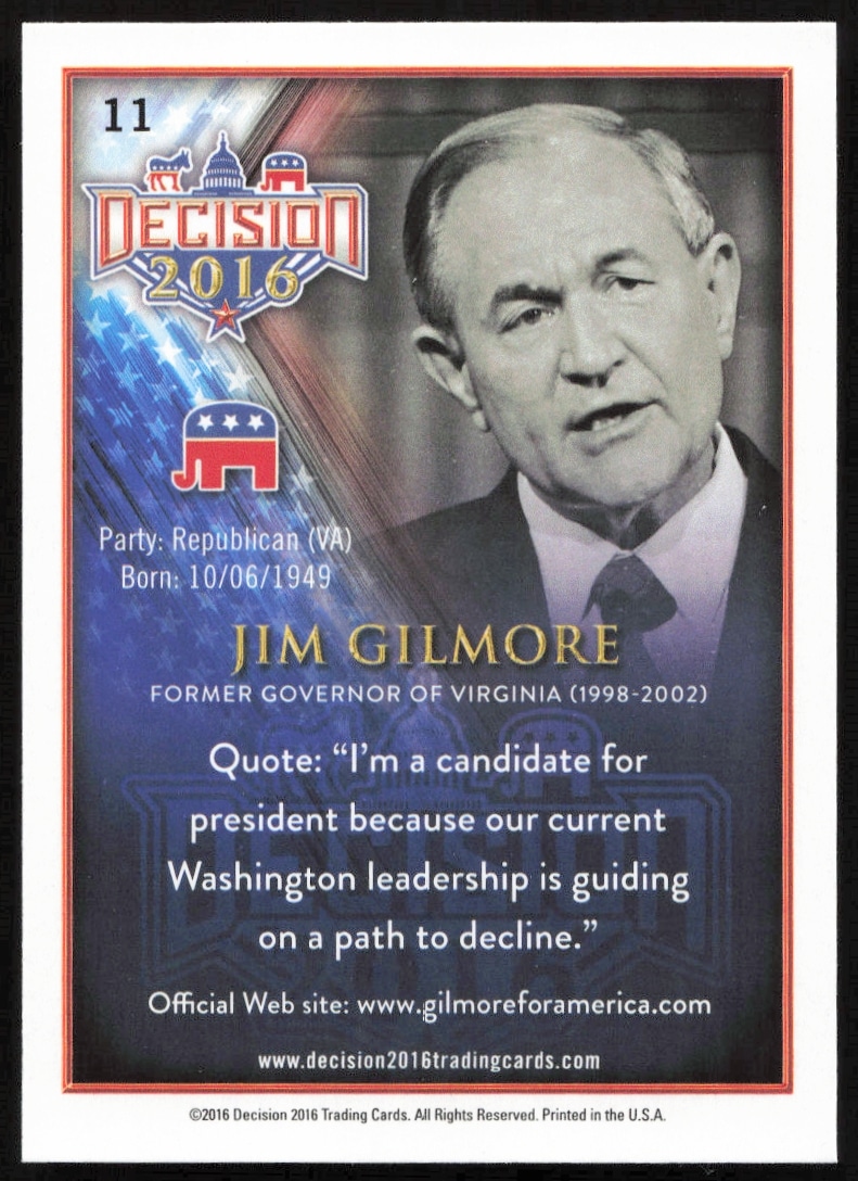 This Political card, from 2016 is part of the Leaf Decision card set. Jim Gilmore is featured and has a card number of 11.