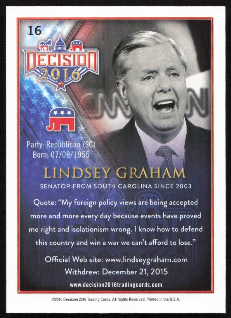 This Political card, from 2016 is part of the Leaf Decision card set. Lindsey Graham is featured and has a card number of 16.