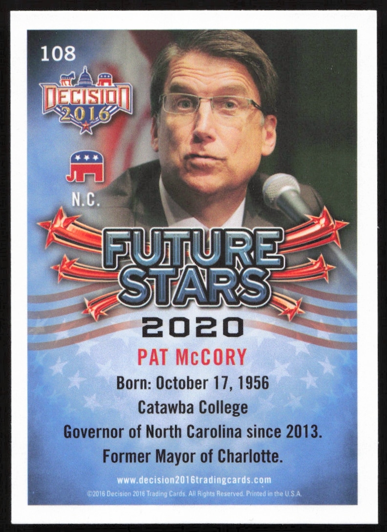 This Political card, from 2016 is part of the Leaf Decision card set. Pat McCory is featured and has a card number of 108.