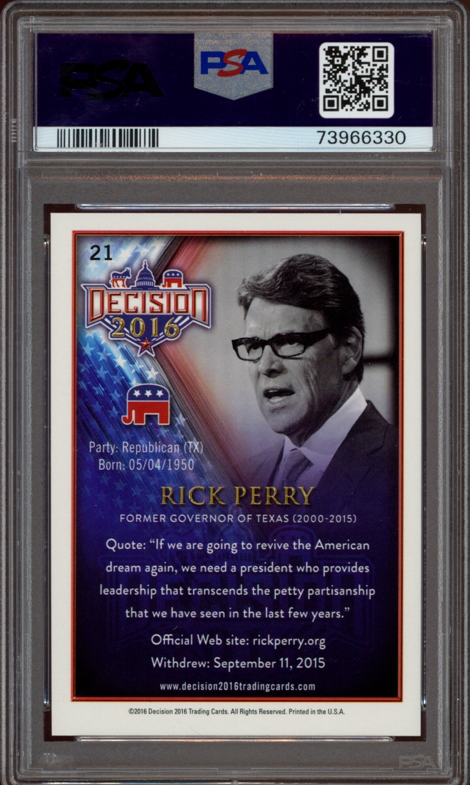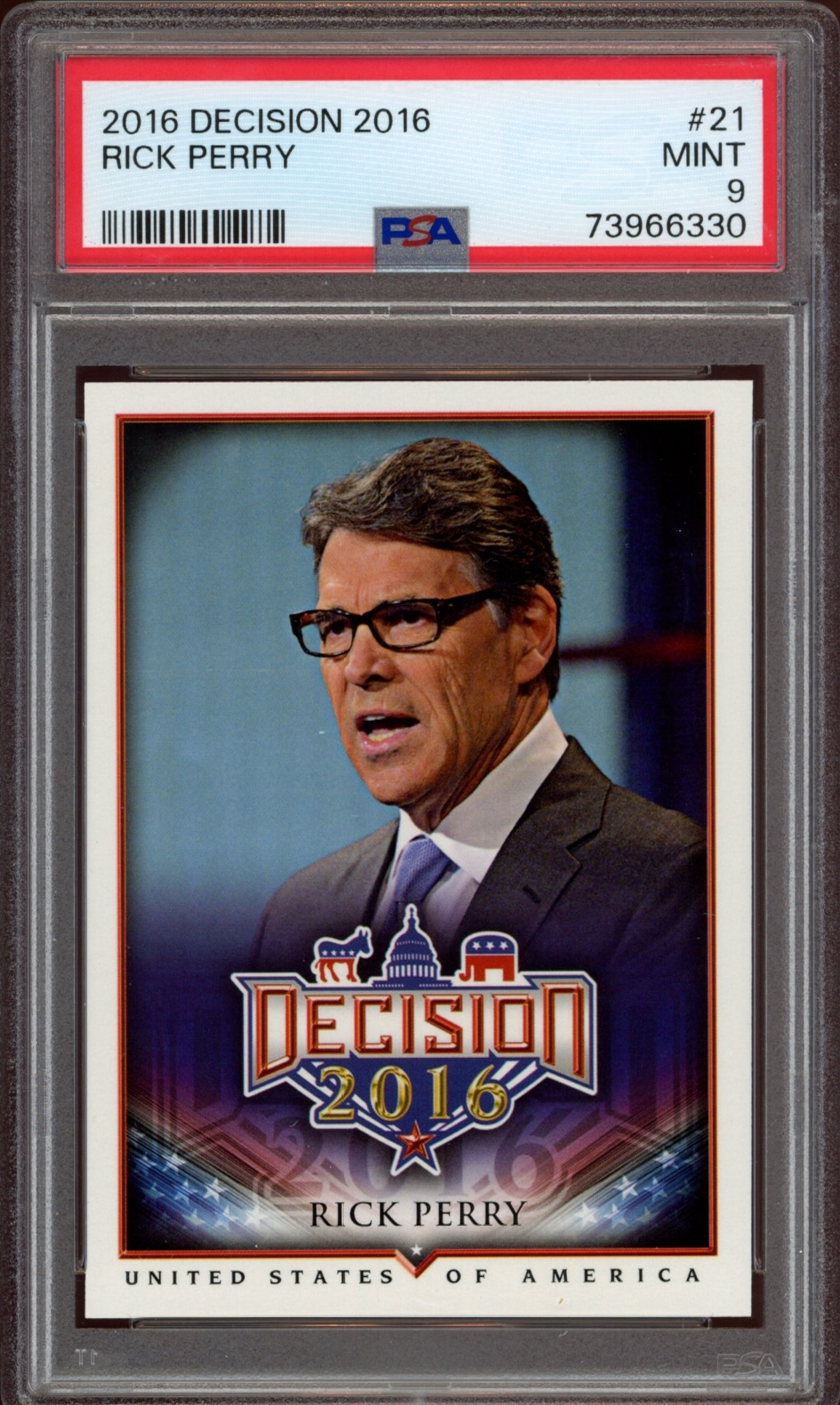 This Political card, from 2016 is part of the Leaf Decision card set. Rick Perry is featured and has a card number of 21. It is graded by PSA and has a numeric grade of 9.