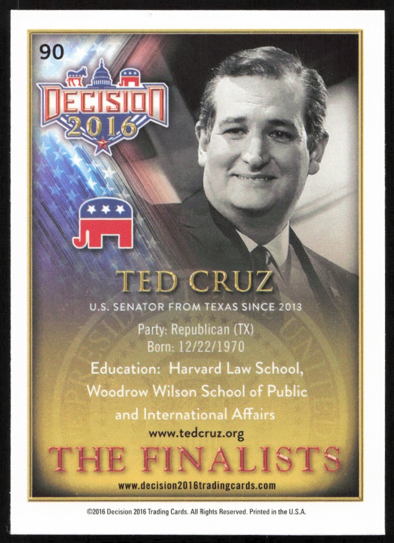 This Political card, from 2016 is part of the Leaf Decision card set. Ted Cruz is featured and has a card number of 90.