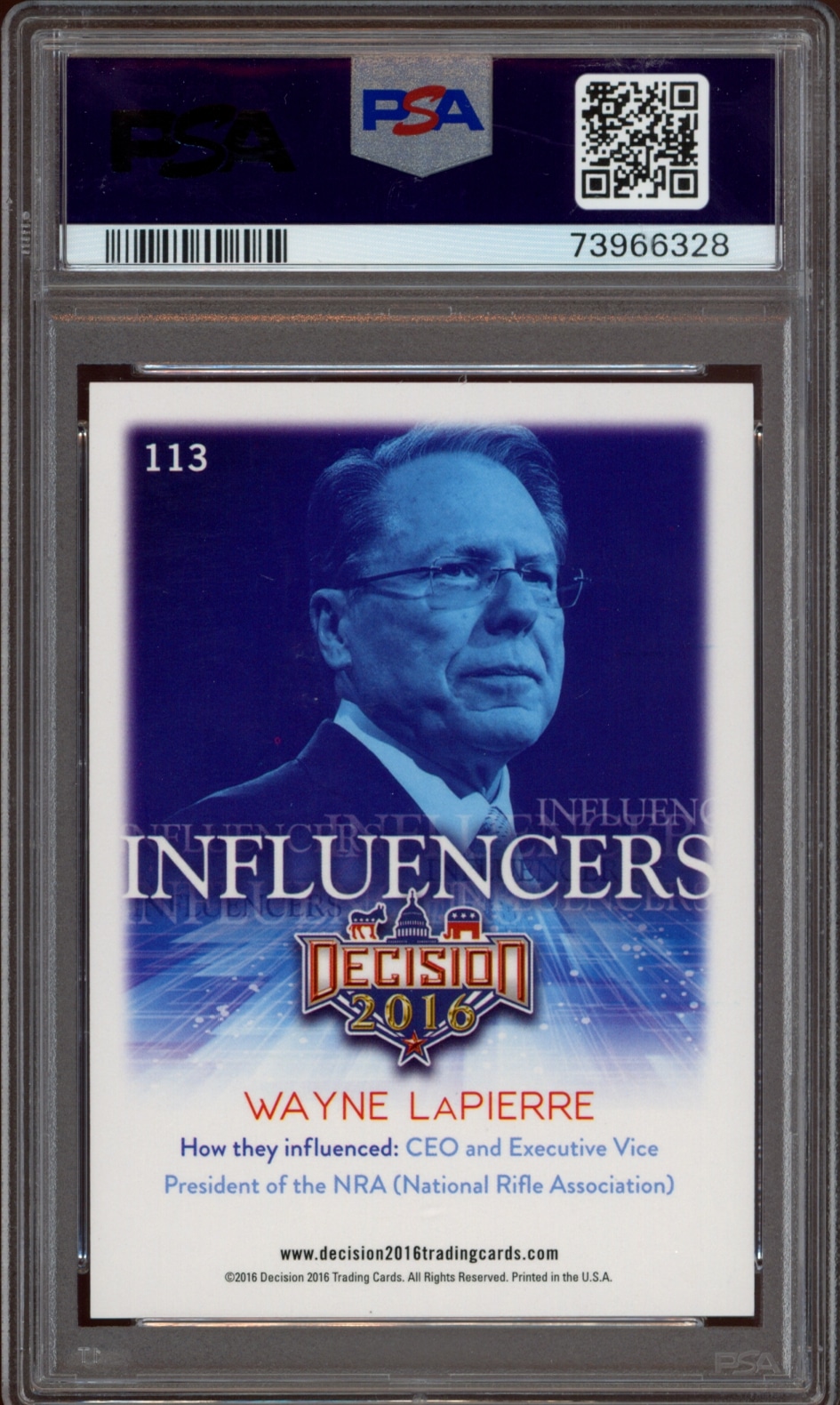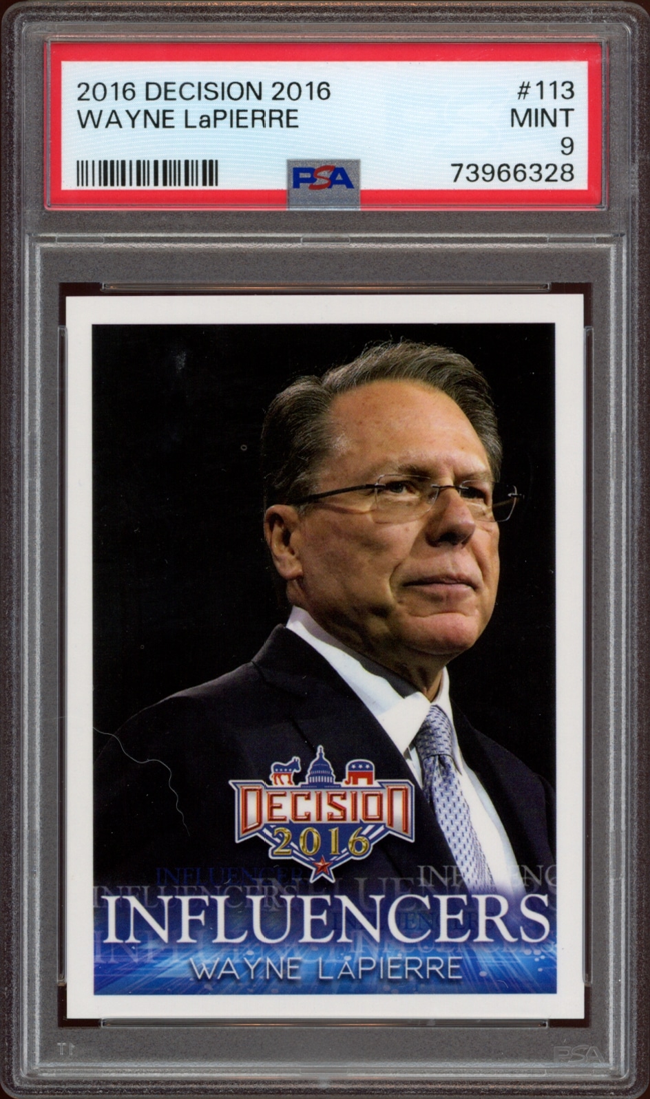 This Political card, from 2016 is part of the Leaf Decision card set. Wayne LaPierre is featured and has a card number of 113. It is graded by PSA and has a numeric grade of 9.