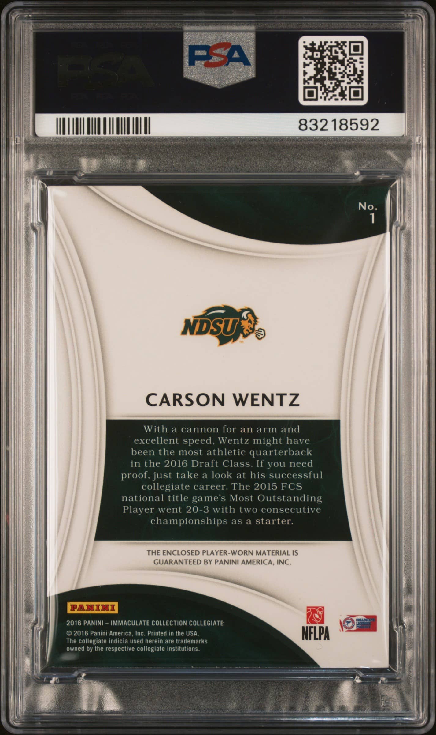 This Football card, from 2016 is part of the Panini Immaculate Collegiate card set. Carson Wentz is featured and has a card number of 1. It is graded by PSA and has a numeric grade of 9.