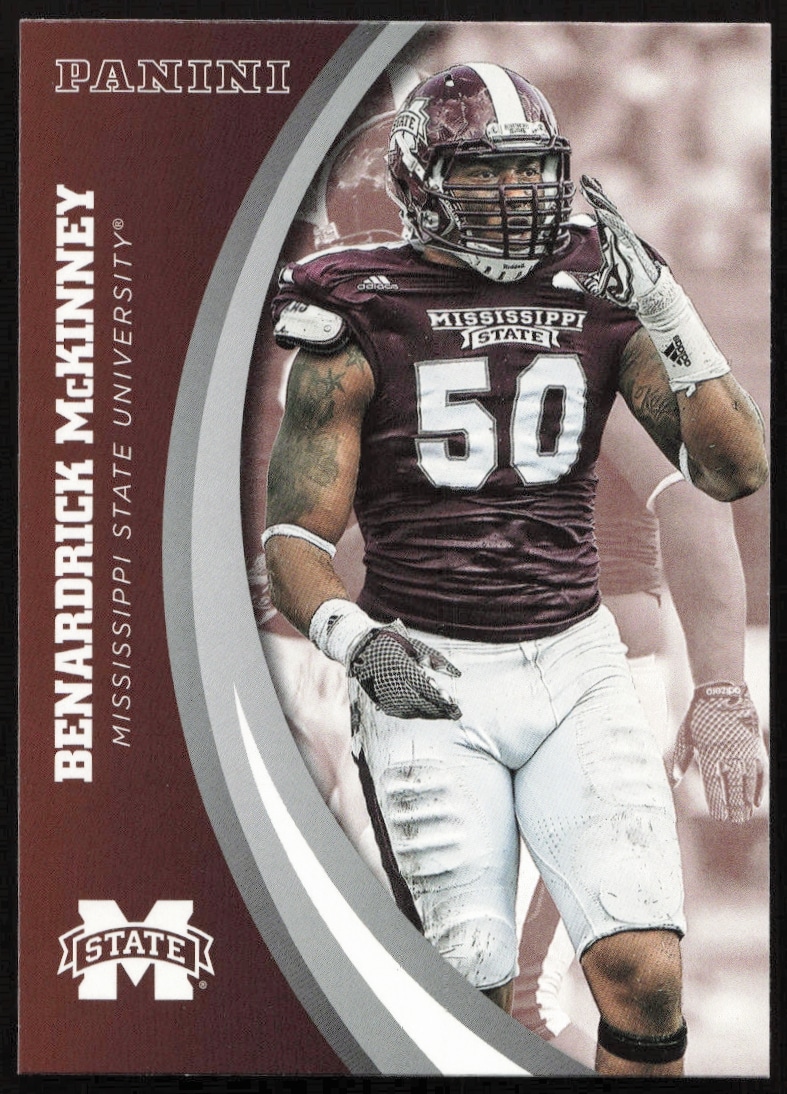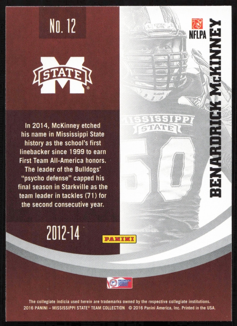 This FootballΒ card, from 2016 is part of the Panini Mississippi StateΒ card set. Benardrick McKinney is featured and has a card number of 12.