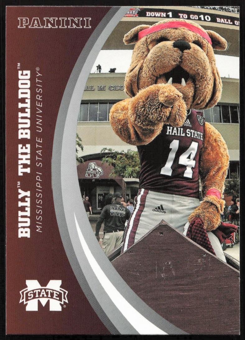 This FootballΒ card, from 2016 is part of the Panini Mississippi StateΒ card set. Bully The Bulldog is featured and has a card number of 1.