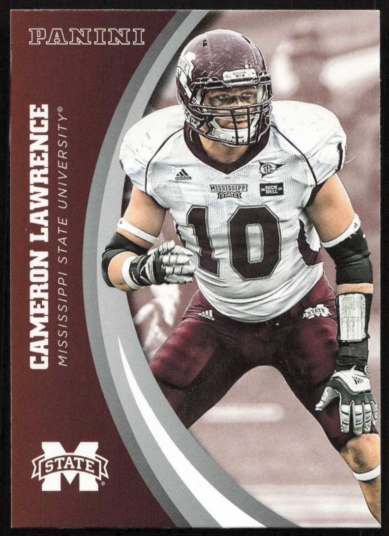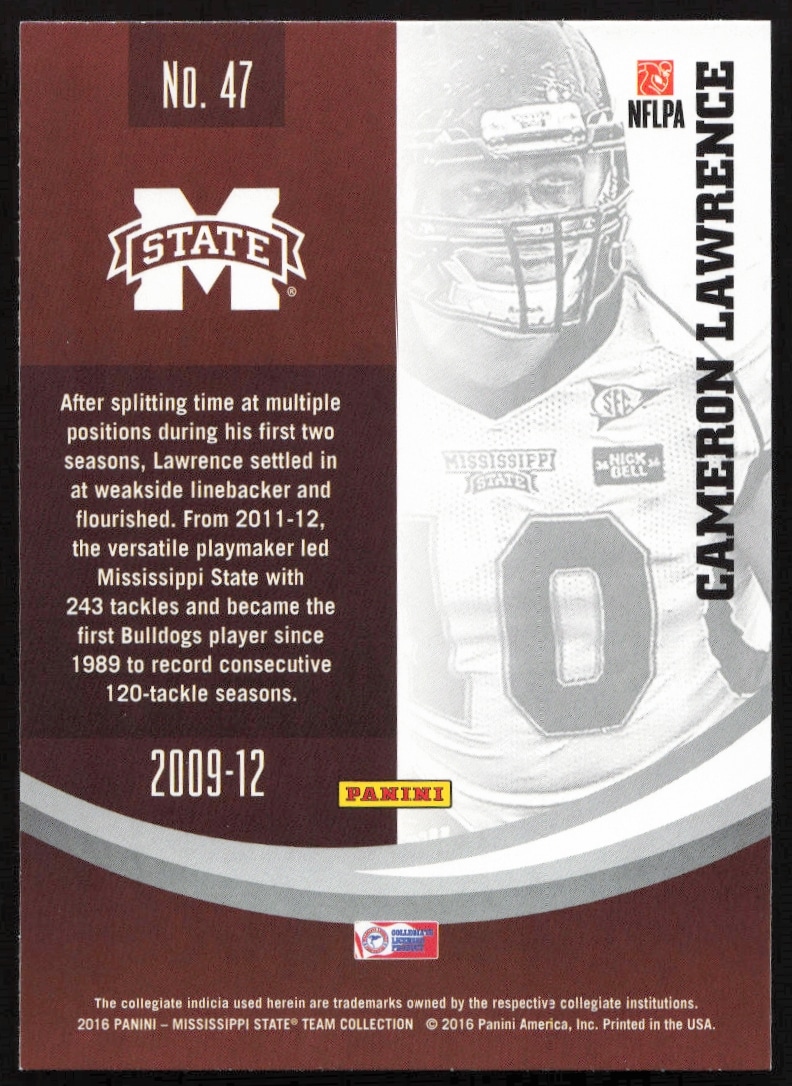 This FootballΒ card, from 2016 is part of the Panini Mississippi StateΒ card set. Cameron Lawrence is featured and has a card number of 47.
