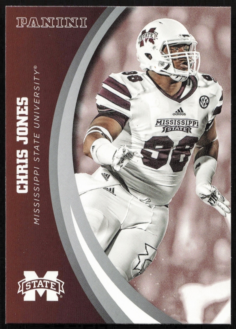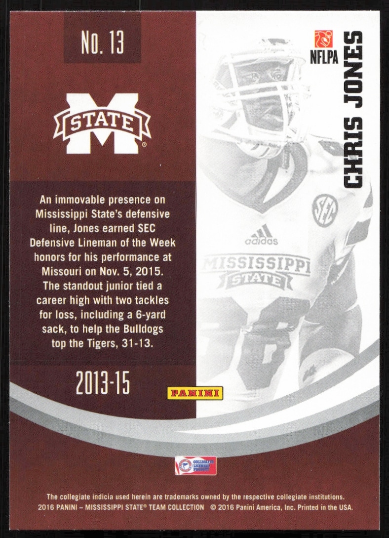This FootballΒ card, from 2016 is part of the Panini Mississippi StateΒ card set. Chris Jones is featured and has a card number of 13.