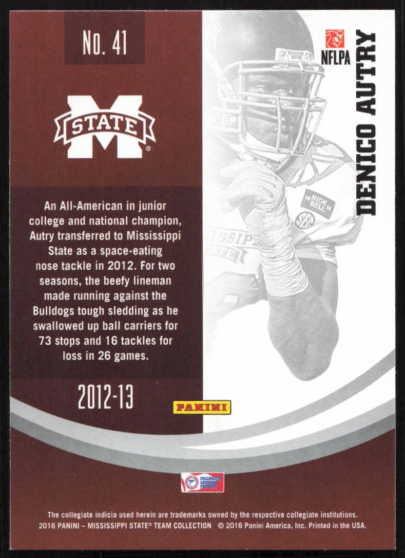 This FootballΒ card, from 2016 is part of the Panini Mississippi StateΒ card set. Denico Autry is featured and has a card number of 41.