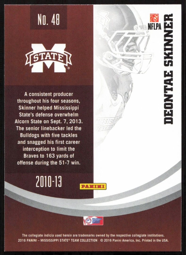 This BaseballΒ card, from 2016 is part of the Panini Mississippi StateΒ card set. Deontae Skinner is featured and has a card number of 48.