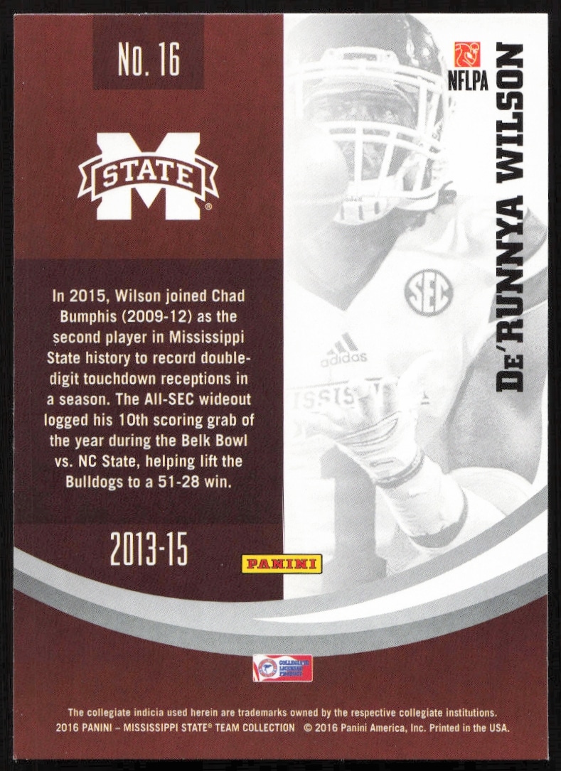 This FootballΒ card, from 2016 is part of the Panini Mississippi StateΒ card set. De’Runnya Wilson is featured and has a card number of 16.