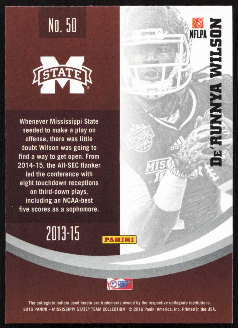 This FootballΒ card, from 2016 is part of the Panini Mississippi StateΒ card set. De’Runnya Wilson is featured and has a card number of 50.