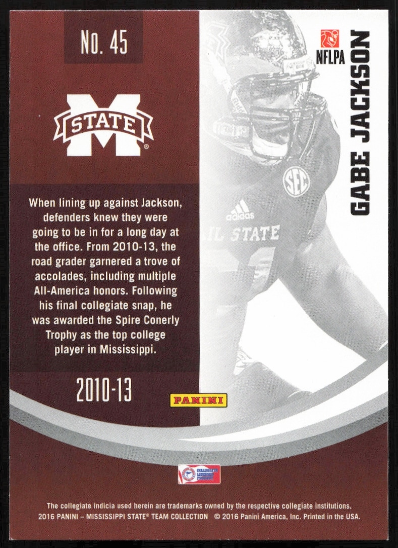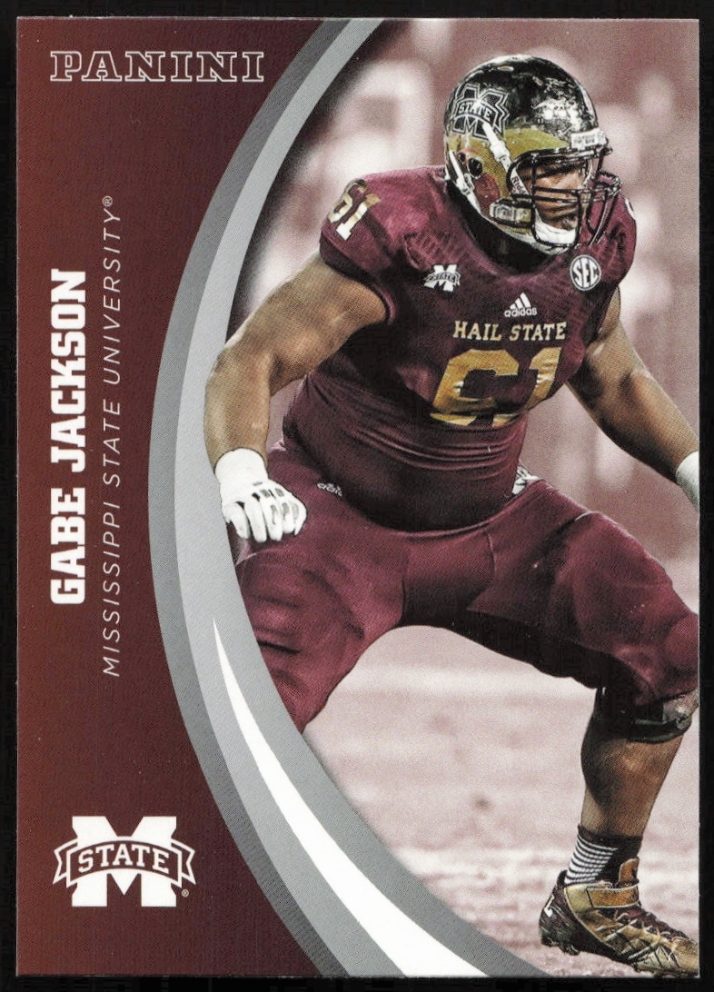 This FootballΒ card, from 2016 is part of the Panini Mississippi StateΒ card set. Gabe Jackson is featured and has a card number of 45.