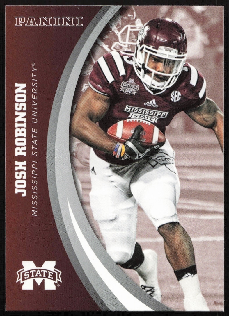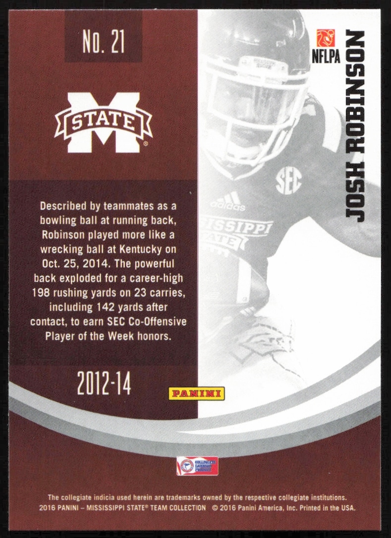 This FootballΒ card, from 2016 is part of the Panini Mississippi StateΒ card set. Josh Robinson is featured and has a card number of 21.