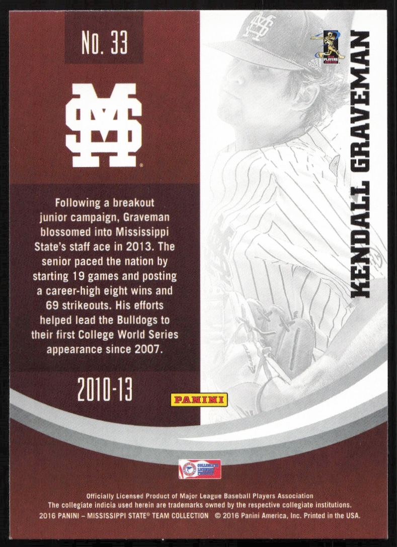 This BaseballΒ card, from 2016 is part of the Panini Mississippi StateΒ card set. Kendall Graveman is featured and has a card number of 33.