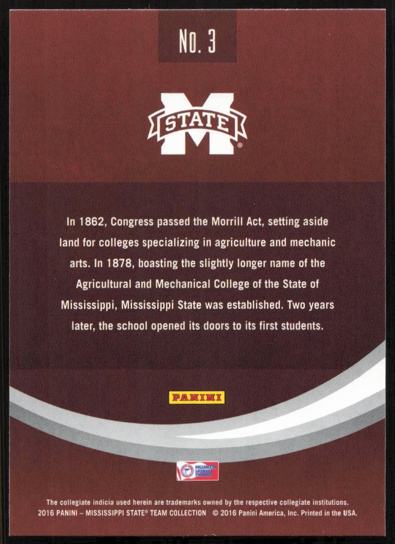 This Multi-sport card, from 2016 is part of the Panini Mississippi State card set. Mississippi State University is featured and has a card number of 3.