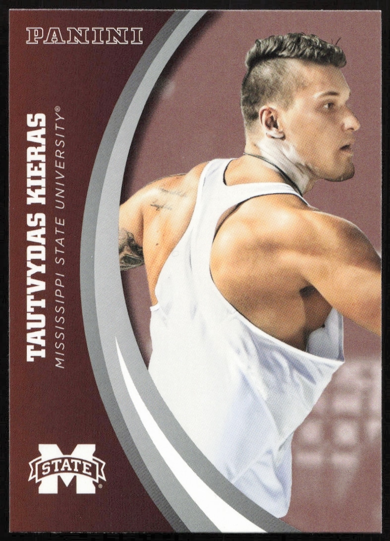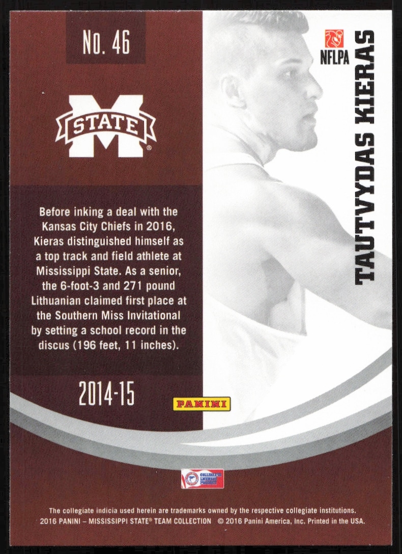 This FootballΒ card, from 2016 is part of the Panini Mississippi StateΒ card set. Tautvydas Kieras is featured and has a card number of 46.