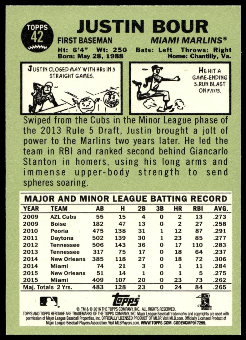 This BaseballΒ card, from 2016 is part of the Topps HeritageΒ card set. Justin Bour is featured and has a card number of 42.