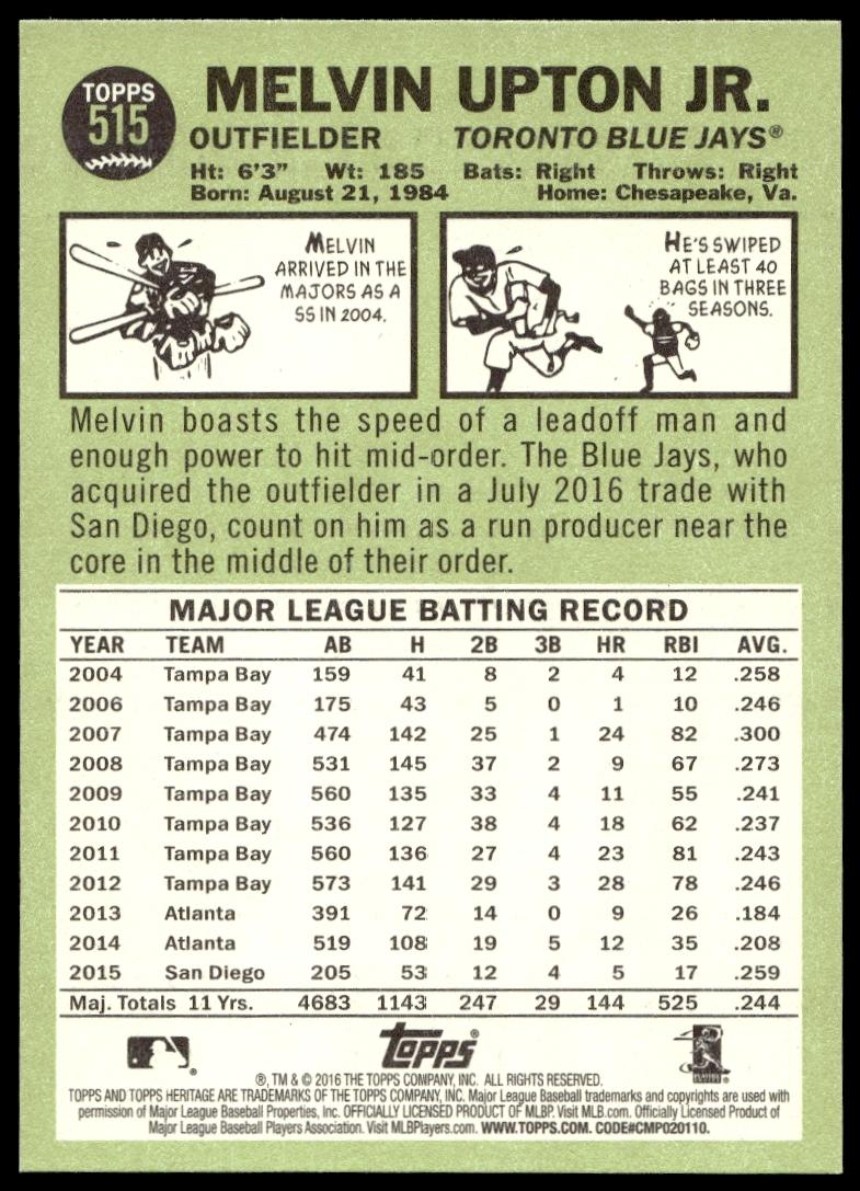 This BaseballΒ card, from 2016 is part of the Topps HeritageΒ card set. Melvin Upton Jr. is featured and has a card number of 515.