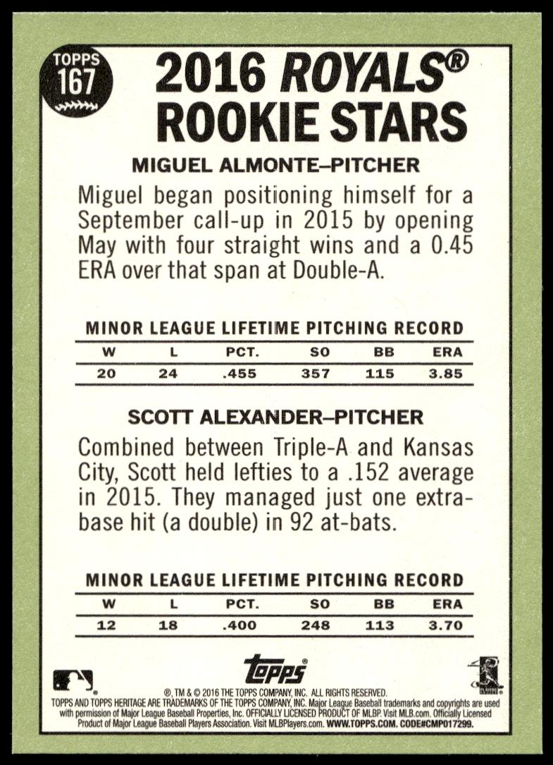 This BaseballΒ card, from 2016 is part of the Topps HeritageΒ card set. Miguel Almonte / Scott Alexander is featured and has a card number of 167.