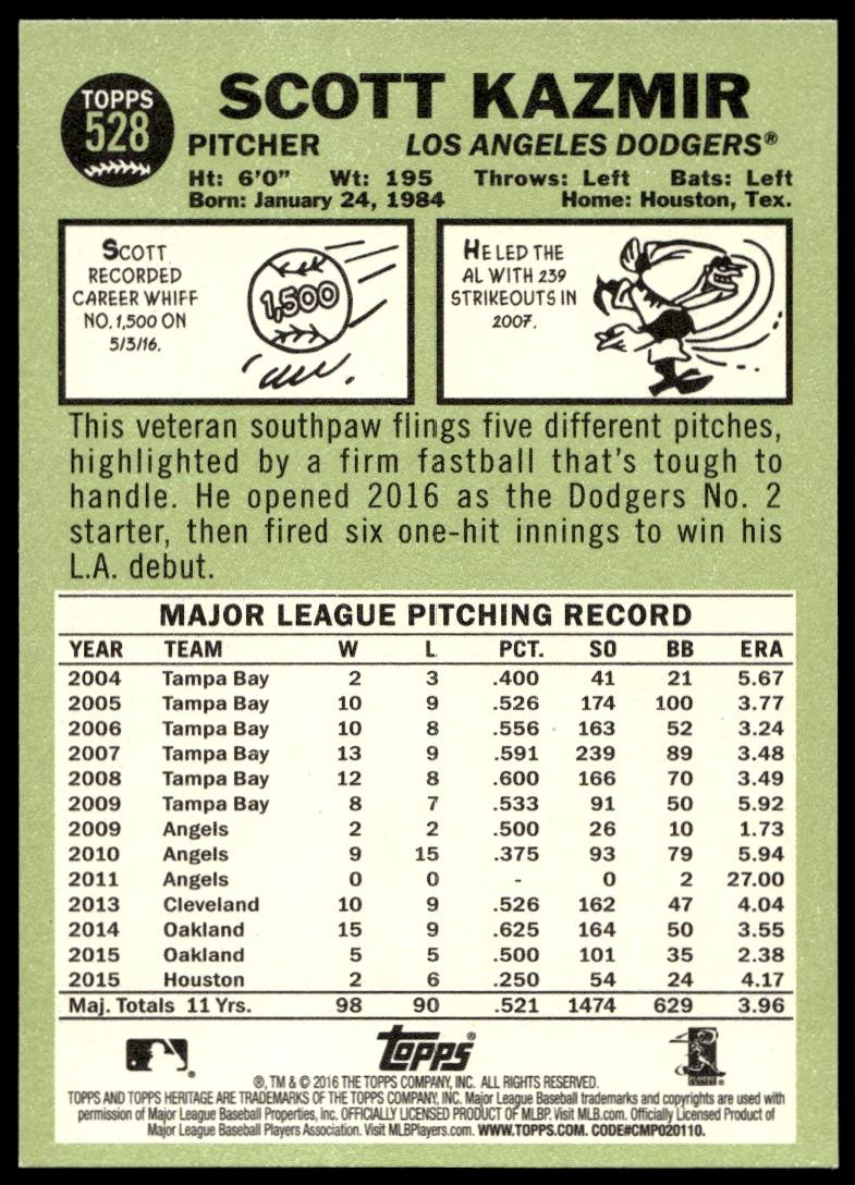 This BaseballΒ card, from 2016 is part of the Topps HeritageΒ card set. Scott Kazmir is featured and has a card number of 528.