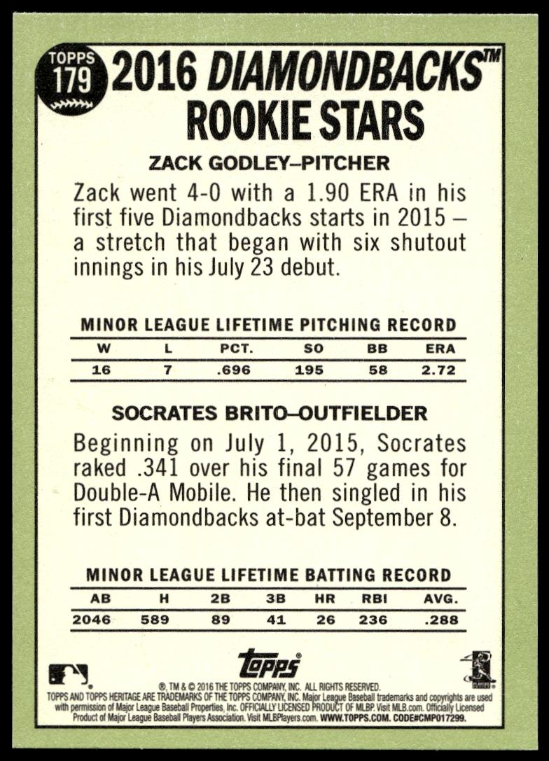 This BaseballΒ card, from 2016 is part of the Topps HeritageΒ card set. Zack Godley / Socrates Brito is featured and has a card number of 179.