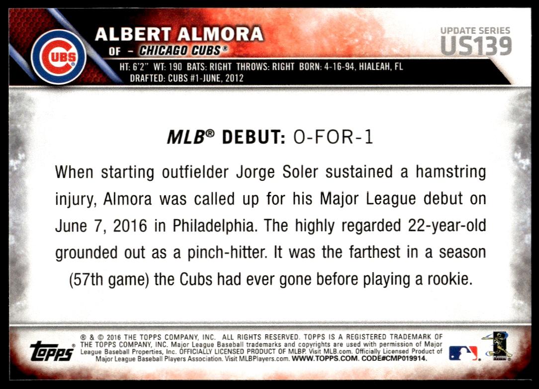 This BaseballΒ card, from 2016 is part of the Topps UpdateΒ card set. Albert Almora is featured and has a card number of US139.