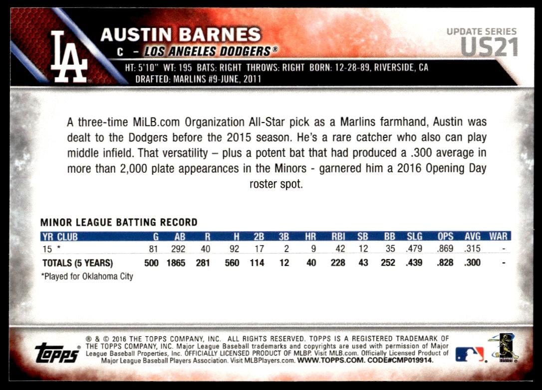 This BaseballΒ card, from 2016 is part of the Topps UpdateΒ card set. Austin Barnes is featured and has a card number of US21.